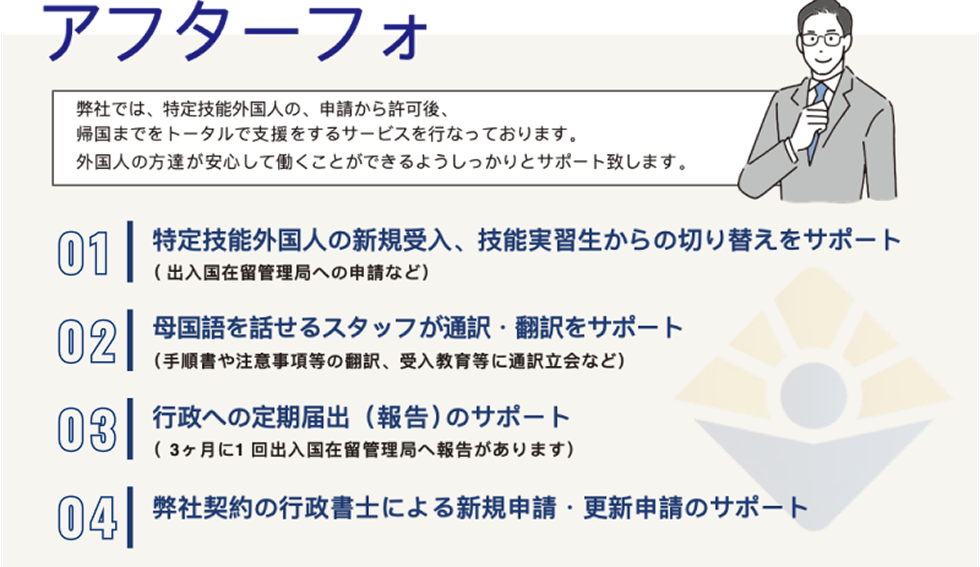 Các công ty tiếp nhận lao động có tư cách lưu trú "Lao động Kỹ năng Đặc biệt Số 1" phải cung cấp chín hạng mục hỗ trợ bắt buộc sau theo quy định của Bộ Tư pháp. Mặc dù mỗi công ty phải tự cung cấp hỗ trợ và đào tạo, nhưng việc hỗ trợ bắt buộc này có thể được thuê ngoài bởi một tổ chức hỗ trợ đã đăng ký.
